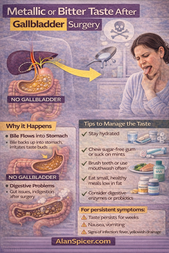 Snippet answer: A bitter taste after gallbladder removal is most commonly caused by reflux (acid or bile irritation), dry mouth/dehydration, or diet and medication changes during recovery. The fastest improvement usually comes from a 48-hour stabilisation reset: smaller meals, no late-night eating, avoiding trigger foods, staying upright after eating, and fixing hydration. Persistent symptoms or red flags deserve clinical assessment.